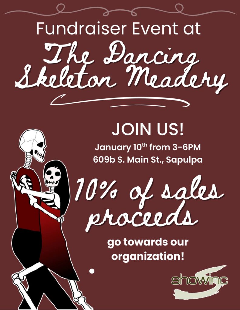 Show Inc. Fundraiser Event at The Dancing Skeleton Meadery — Sapulpa — Saturday, January 10, 2026, 3:00 PM. Community fundraiser where the meadery donates 10% of sales to Show Inc. Show Inc. Fundraiser Event at The Dancing Skeleton Meadery ↗