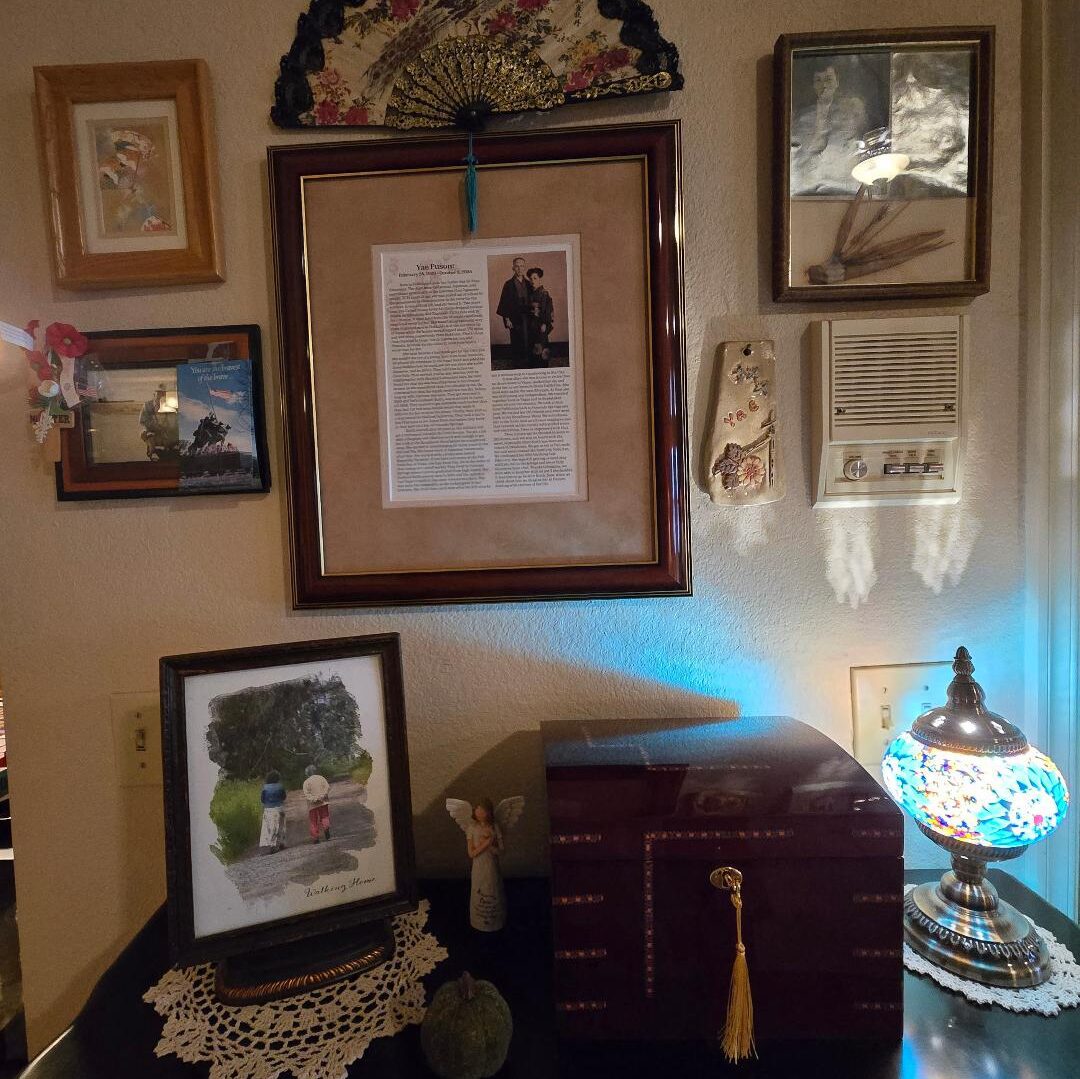 About this time last year, we were still grieving the loss of Carlene’s mother. We were blessed to have her living with us for the past quarter-century. New Year’s Eve was particularly sad as the three of us always toasted the new year with a shot or two of the finest Sake. She had a fascinating life, and it was my pleasure to write her obituary. We framed it and dedicated a wall in the gathering room for Carlene’s parents.