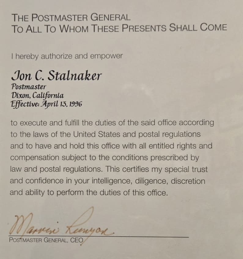 I had an opportunity to speak with the District Manager about this, and he said to me, “Wouldn’t it be a waste of your talents to put you in an office that didn’t even have any delivery employees?” Yes, delivery was something I was well trained in, and hearing that comment from the top manager in our district opened my eyes to what was really going on. John was preparing me for a higher-level postmaster job, and the district manager was in on it. I was eventually appointed Postmaster in Dixon, California, a job that would benefit from all the preparation I had received.
