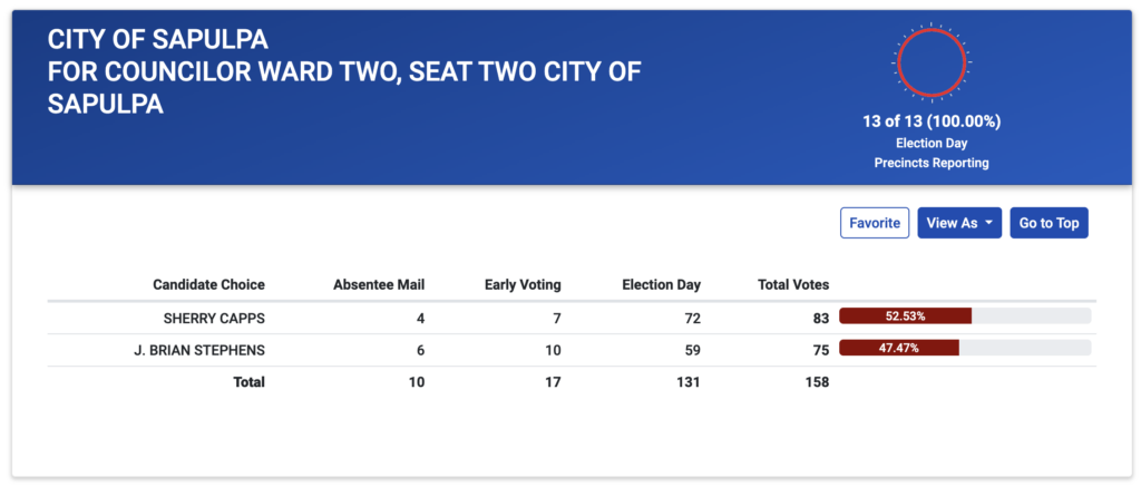 Challenger Sherry Capps has defeated incumbent Brian Stephens for the Ward 2, Seat 2 spot on Sapulpa’s City Council.