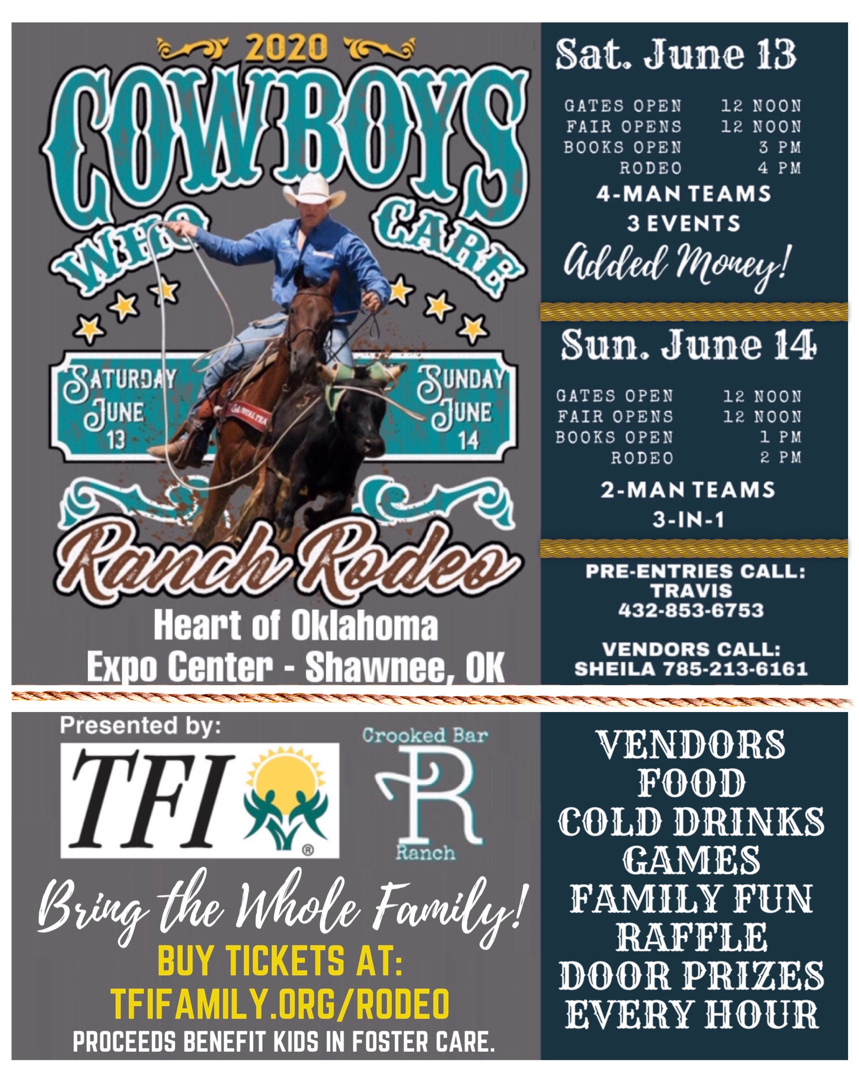 (Tulsa, OK)—TFI Oklahoma and Crooked R Ranch is hosting the Cowboys Who Care Ranch Rodeo on Saturday, June 5, at the Creek County Fairgrounds, Kellyville, OK. All proceeds from the ranch rodeo will benefit local children in foster care.