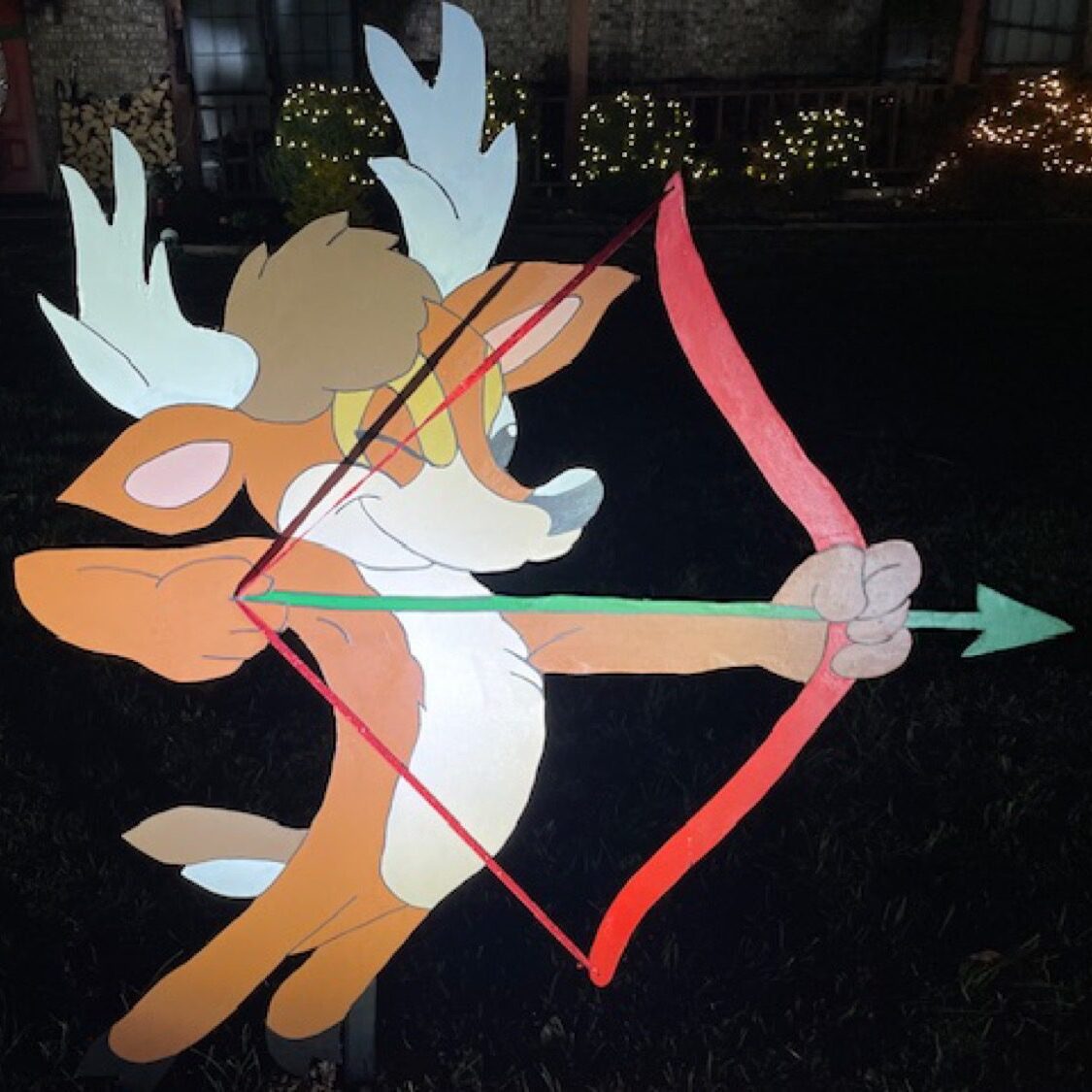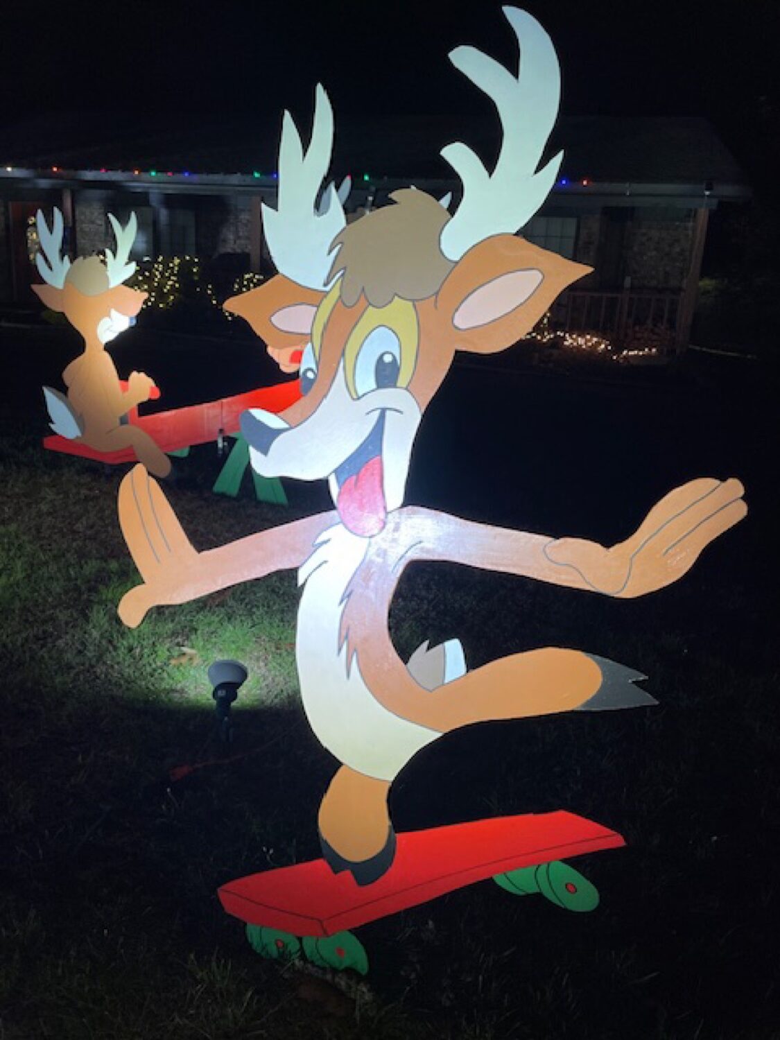 The wooden cutouts show the reindeer playing with what could be the toys from Santa’s pack, including roller skates, a bow and arrow, a pogo stick, and more.