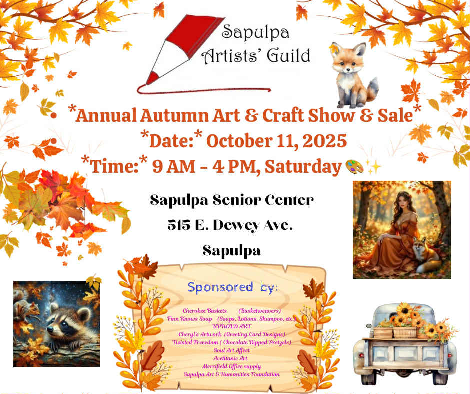 The Artists’ Guild annual autumn show and sale is back! Come see all the arts, crafts, home decor and more at the Sapulpa Senior Center (515 E Dewey).