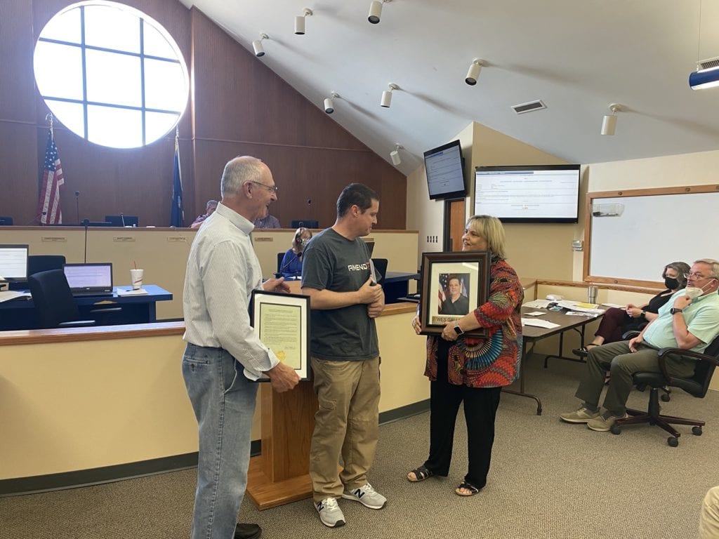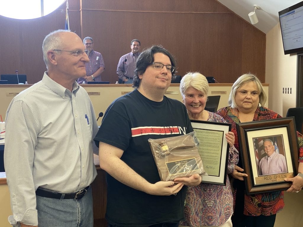 The last recognition of outgoing councilors was an honorarium of the late Mayor Reg Green, who passed away in January. City Attorney David Widdoes invited Green’s widow Carolyn and his son Ryan to the front to receive a special plaque and proclamation honoring the longtime Mayor. The entire council and those in the audience stood and strongly applauded the Greens.