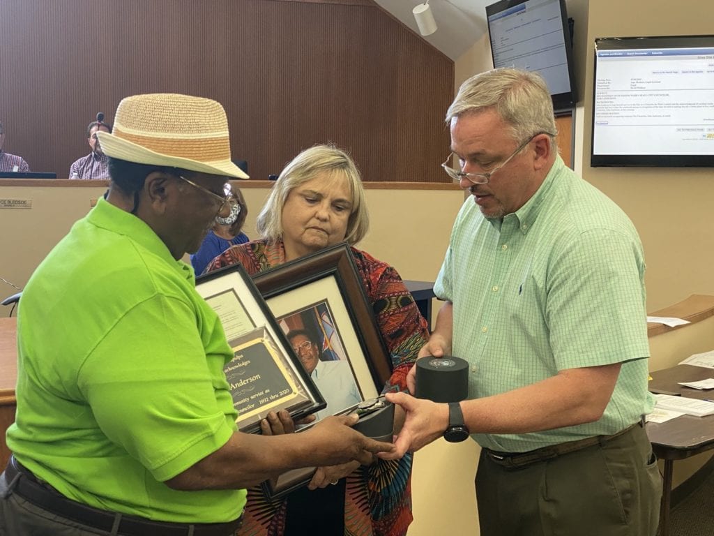 John Anderson recieves a plaque from City Manager Joan Riley