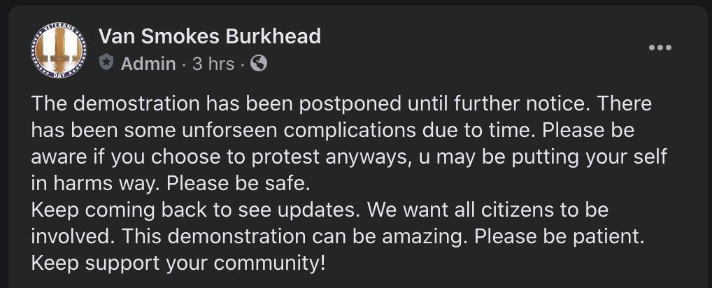 After the Sapulpa Police made their announcement, Burkhead posted to the group saying that demonstration had been postponed due to “unforeseen complications.” He cautions those that might decide to protest anyway, that they may be putting themselves in harm’s way: