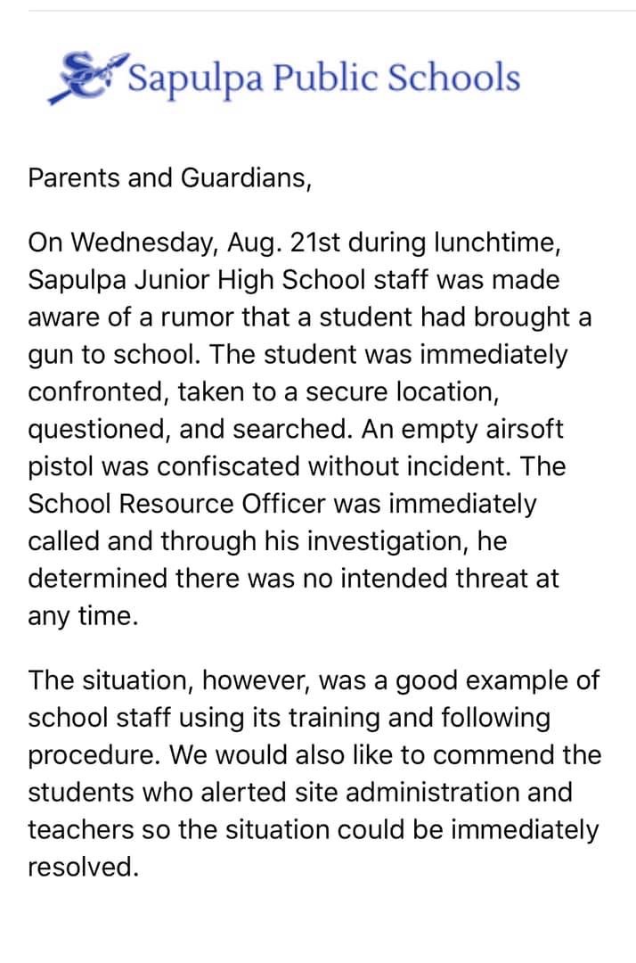 Sapulpa Administration says teachers were notified near lunchtime and the student was immediately confronted and handed over the airsoft pistol without incident.