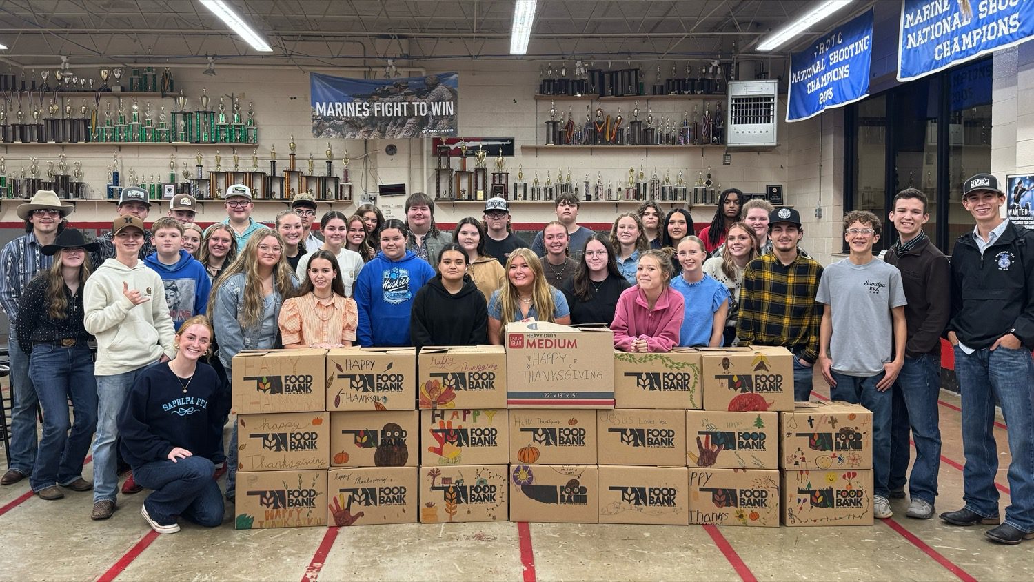 Sapulpa FFA hosted the first community service project for the year by building, assembling, and donating 20 Thanksgiving meal boxes. The boxes go to families who may not otherwise get a Thanksgiving dinner. These boxes included turkeys, various sides, and a pumpkin pie kit.