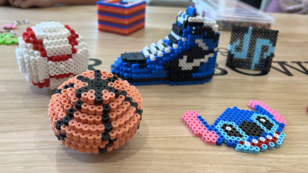 “I made this basketball right here, which failed,” he said, chuckling. “It’s too flat. If I had to start over, I’d make it more round like this,” showing off a baseball, with red beads to give it a rounded stitching effect.