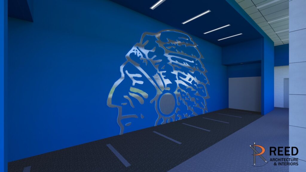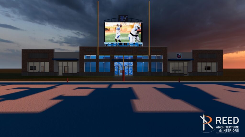 The end zone facility at George F. Collins Stadium will offer upgraded locker rooms, coaches’ offices, and athletic training space. The Chieftain logo will be prominently displayed, recognizing the community’s support for the district’s athletic programs. The video scoreboard will be installed atop the new structure.