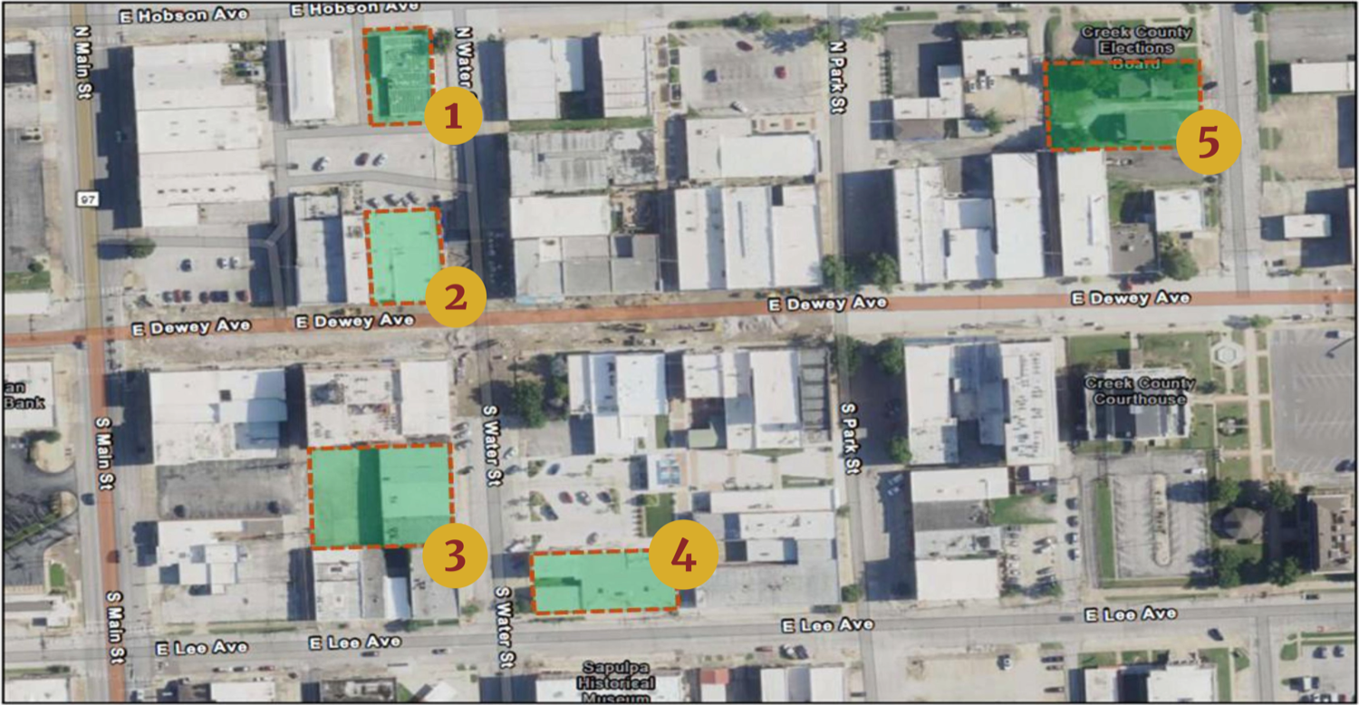 The loss of parking spaces on Dewey (the study estimated 52-56 spaces) was a point of concern when the streetscape project was announced, and the City of Sapulpa has been investigating options to make up for the lost spaces. In the study, Bruce presented five options near major thoroughfares where buildings could be removed to make room for additional or expanded parking.