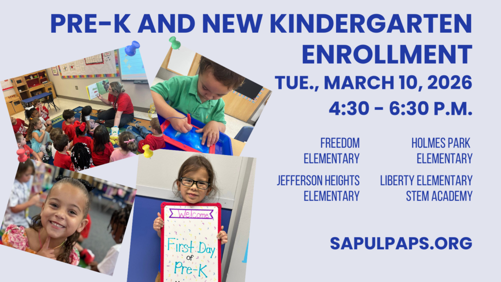 Sapulpa Public Schools Pre-K and New Kindergarten Enrollment for the 2026-27 school year will take place at the elementary school of parent/guardian’s district address on Tuesday, March 10, 2026, 4:30 p.m. – 6:30 p.m.