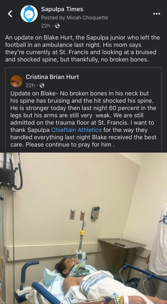 The top story is the recovery story of Sapulpa High Junior Blake Hurt, who took a considerable shock to his spine in the final minutes of the 50-0 shutout game against Glenpool on Friday. After he left the field in an ambulance, many of our readers were wondering about his condition. Thankfully, his mom reached out to us on Saturday to let us know that doctors were saying that Hurt’s spine was bruised, but not broken. By Saturday afternoon, he had been allowed to go home: