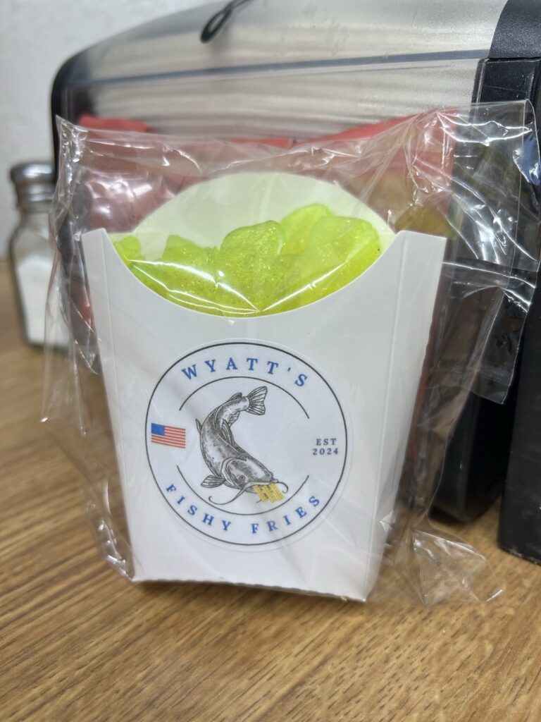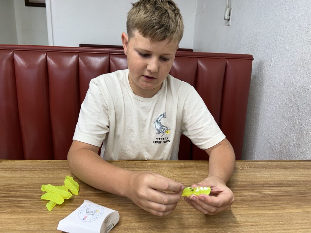 Wyatt’s mom, Jai Webb, owns J’s Country Kitchen in Kellyville. Adding the label against eating the Fishy Fries was her idea. She says that the Fries—which she helps create—could be mistaken for gummy worms.