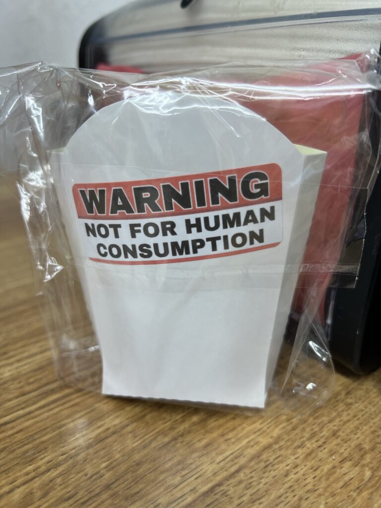 Each order sells for $7 and contains ten of Wyatt’s Fishy Fries and two hooks in a box shaped like a french fry holder. On the front is a logo of a catfish eating crinkle-cut french fries next to an American flag. On the back is a label warning: “not for human consumption.”
