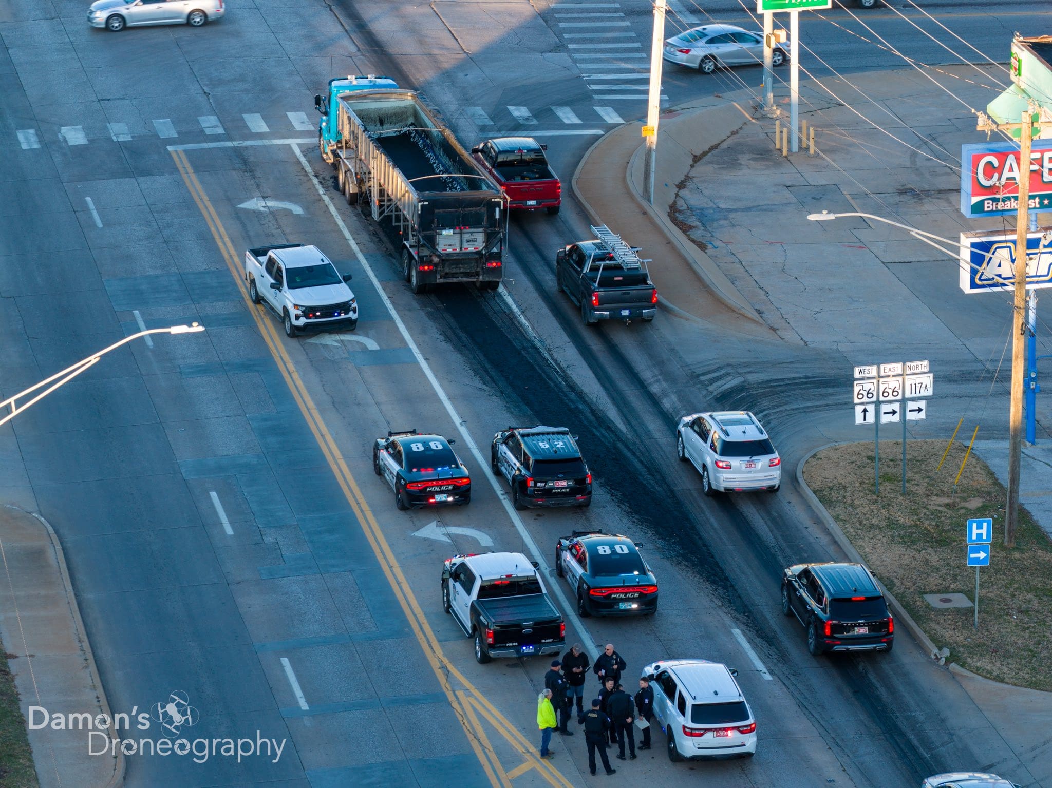 Originally believed to be asphalt, the contents of the truck was later determined to be biosolids—that is, processed residuals from wastewater.