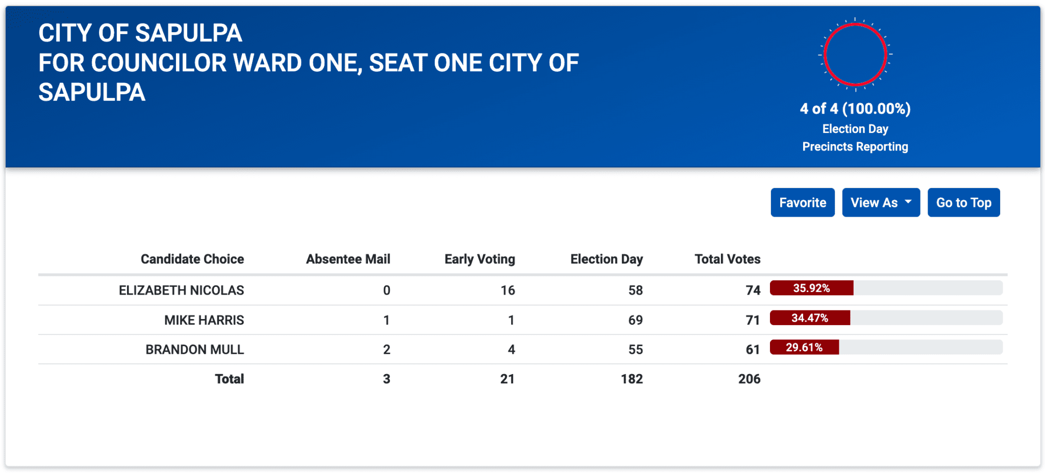 “Thank you, Sapulpa, for voting today,” he said. “Your voice was heard and counted. Let’s go forward to work together in making our great city even better.”